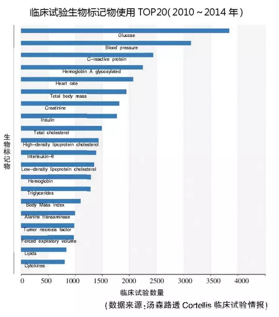 根据Cortellis临床试验情报(CTI),自2000年以来,临床试验中的生物标记物使用增加了3倍以上,2000~2004年,开展了6620项;2005~2009年,开展了17,803项;2010~2014年,开展了28,821项。其中,肿瘤坏死因子和细胞因子等标记物的使用持续增长,属于前20名的生物标记物。
