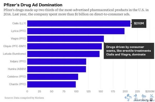 尼尔森数据指出,直接面向消费者广告支出TOP 10处方药中,辉瑞则独揽了7个,其中疼痛药物Lyrica、勃起功能障碍(ED)药物威尔刚(Viagra)、抗凝血剂Eliquis进入榜单前5名。辉瑞在2014年的销售额为457亿美元,而这7个药物合计贡献了105亿美元。TOP 10处方药中,礼来的ED药物希爱力(Cialis)以2.1亿美元的广告支出位居榜首。