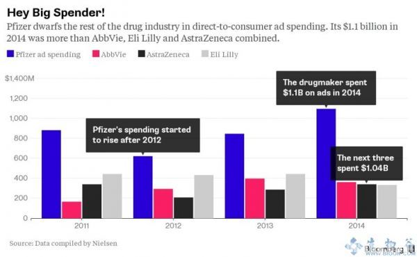 报告指出,医药领域,2014年处方药消费者广告支出为45亿美元,较2013年增长21%,其中辉瑞以绝对的优势高居榜首。另据尼尔森(Nielsen)数据,辉瑞在2014年的药品广告支出是排在其后的艾伯维(AbbVie)、阿斯利康(AZN)和礼来(Eli Lilly)3家药企广告支出的总和。这一年,辉瑞仅电视广告支出就达到了7.52亿美元,比第二名艾伯维(AbbVie)总的广告支出多出一倍不止。