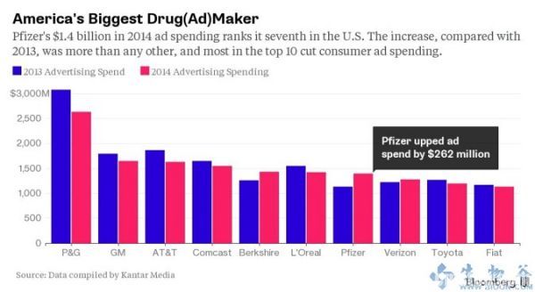 近日,媒体洞察及行业分析领导者Kantar Media(坎塔媒体)发布最新研究报告指出,美国各行业在2014年的总广告支出达到了1412亿美元,较上一年增长0.7%。TOP 100企业中,宝洁(P&G)以23.36亿美元稳居榜首,而美国制药巨头辉瑞(Pfizer)是唯一一个进入榜单前10名的药企,该公司在2014年的广告支出达到了14亿美元,较2013年上涨23.0%。