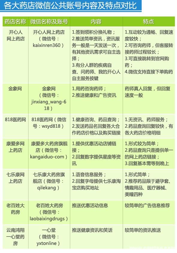 调查发现,包括开心人网上药店、金象网、818医药网等在内的医药电商,已经开始进军微信领域,而传统连锁药店十强中的老百姓大药房、云南鸿翔一心堂药房和广东大参林也开通了微信公共账号,漱玉平民大药房则推出了微信“微大夫”,力图从服务赢得粉丝用户。