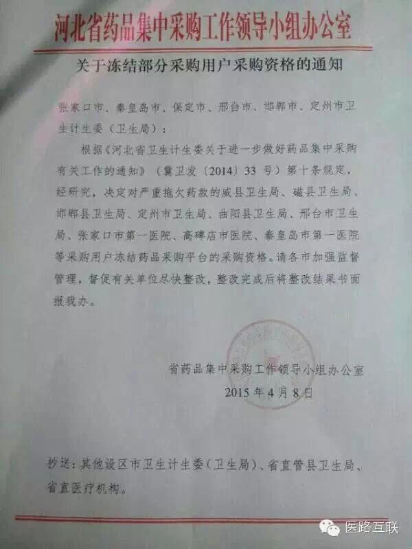 4月11日,微信公众号医路互联推送一篇内容为一张图片,主要内容为河北一些医院、卫生局因回款不及时,被暂停了采购账户。