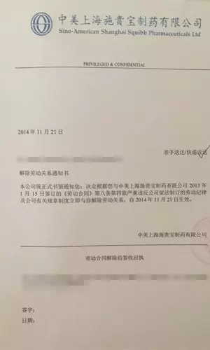在39健康网编辑获取的一份裁员《解除劳动合同通知书》中显示,由于该员工违反了施贵宝在《劳动合同》第八条第四款严重违反公司依法制定的劳动记录及公司有关规章制度,因此立即解除劳动关系。