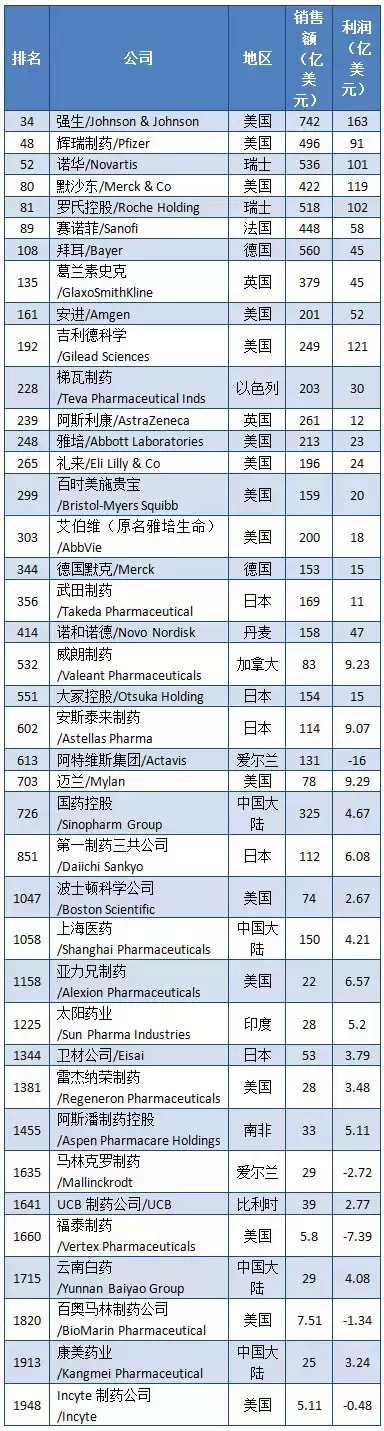 在2000强企业中,笔者统计出了上榜的医药企业,共40家。其中,强生以742亿美元销售额,163亿美元利润排在34名(医药企业第一),其次是辉瑞制药(48名)、诺华(52名)。