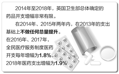 2014年至2018年,英国卫生部总体确定的药品开支增幅非常有限。在2014年、2015年,NHS冻结医药开支,在2013年的支出基础上不作任何总量提升。在2016年、2017年,全民医疗服务制度医药开支每年增幅为1.8%。2018年医药支出增幅为1.9%。为了促进英国医药行业的发展,英国政府的上述总体支出控制计划将部分项目排除在外。其中包括年收入在500万英镑以下的小型企业、疫苗和流感用药的核心供应商以及所有医药公司在近期推广上市的新产品。
