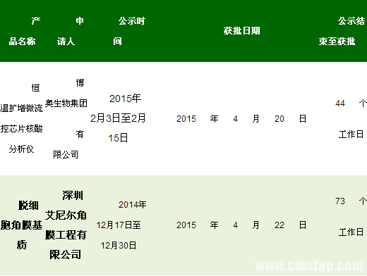 2015年5月5日,国家食品药品监督管理总局宣布:2个医疗器械产品通过了“创新医疗器械特别审批程序”,批准注册。详细信息如下:
