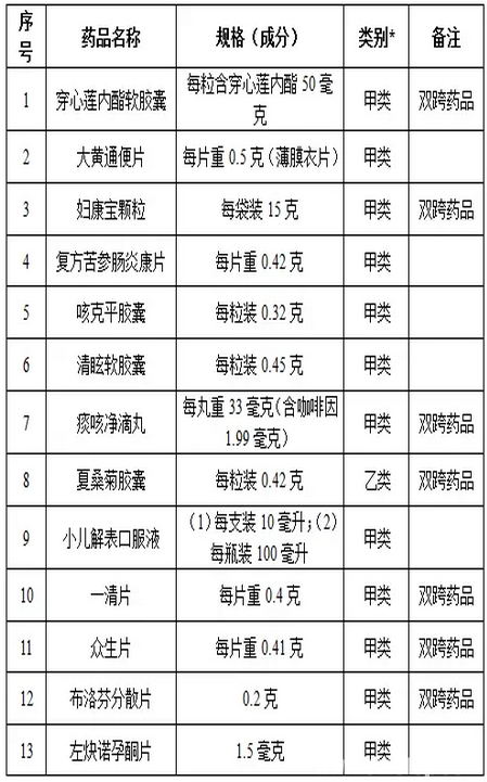 国家药监总局日前发布《关于穿心莲内酯软胶囊等13种药品转换为非处方药的公告》,根据《处方药与非处方药分类管理办法(试行)》(国家药品监督管理局令第10号)的规定,经国家食品药品监督管理总局组织论证和审定,将穿心莲内酯软胶囊等11种中成药、布洛芬分散片等2种化学药品由处方药转换为非处方药(名单见附件)。