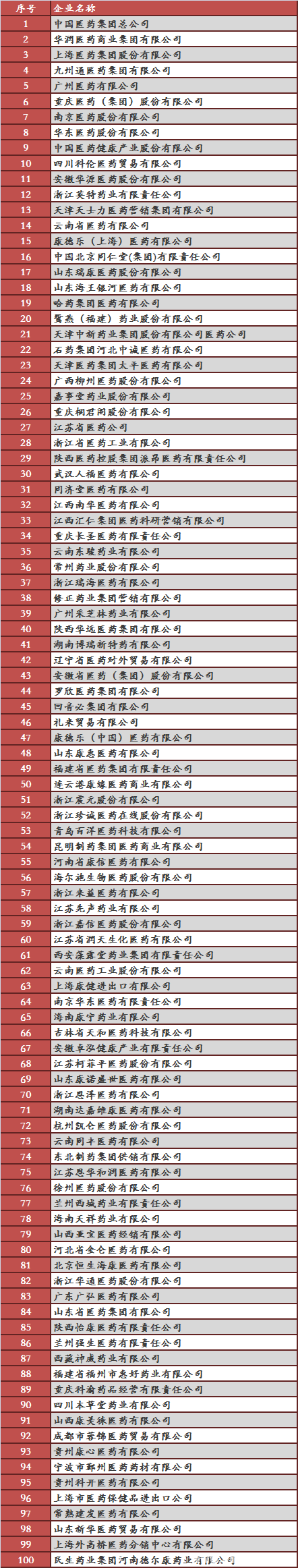 2015年5月14日,在由中国医药商业协会主办的“2015中国药品流通行业资本论坛——互联网+时代的药品流通行业投资机会”上,中国医药商业协会受商务部委托,发布了2014年药品批发企业主营业务收入前百位排序。据介绍,2014年药品批发类前百位企业主营业务收入8460亿元,占同期全国医药市场总规模的65.9%,比上年提高1.6个百分点,其中15家超过100亿元。