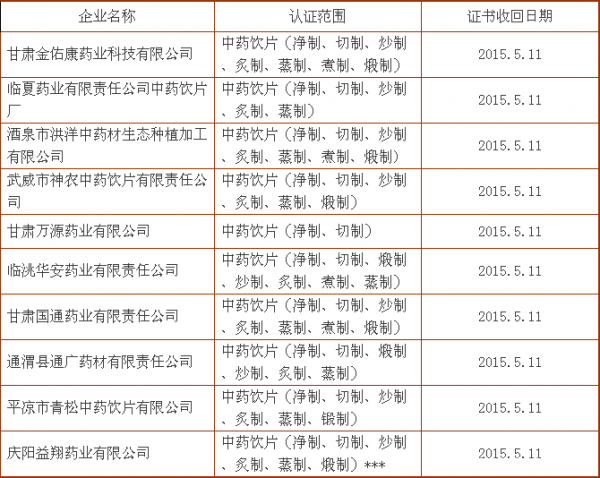 5月15日,甘肃省食药监局发布收回10家药企GMP认证的通知,通知称,甘肃金佑康药业科技有限公司等10家中药饮片生产企业存在严重违反《药品管理法》及药品GMP相关规定情形,已不符合新修订药品GMP评定标准,依据《药品生产监督管理办法》第五十五条,该局依法收回其《药品GMP证书》,现予以公布。