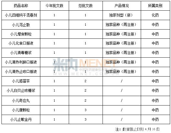 截止至4月中旬,“小儿”类儿童药共获得近90张批文,其中中药55个、化药32个。其中获批文数最多的药品是小儿氨酚黄那敏颗粒,今年共计9个批文,而历年全国共计283张批文;而最少的是小儿四维钙干混悬剂和小儿泻止散等品种,原因是它们为独家品种或独家剂型。今年获得单张批文的涉及25个品种,独家的涉及7个品种,其余为历史有多家生产的药物。