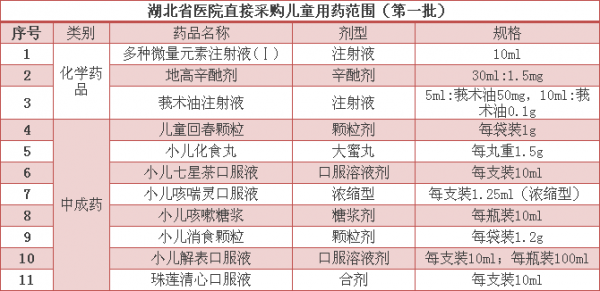 作为第一个响应7号文对于妇儿专科用药直接挂网要求的省份,湖北早在4月28日就发布了《湖北省医院直接采购儿童用药范围(第一批)》,其中包括11个通用名、13个规格。