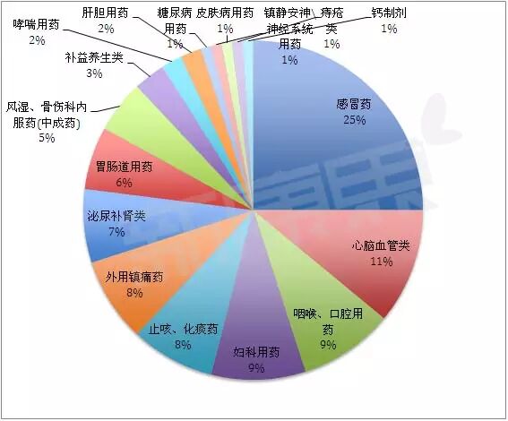 中成药TOP100品种最多的品类是感冒药,有25个。2014年中国药品零售市场感冒药的总体规模约221亿元,中成药感冒药市场规模就达174亿元,占整个感冒药市场的79%。而这25个中成药TOP100品种中的感冒药市场规模合计123亿,又占了中成药感冒药市场的69%。
