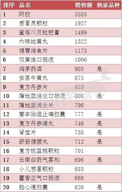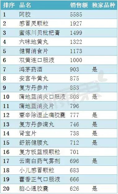 2014年中国药品零售市场中成药TOP20品种(单位:百万元)
