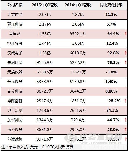 值得注意的是,今年的统计表单中增加了两位新成员——南华仪器与苏试试验。作为2015年创业板的仪器新股,南华仪器与苏试试验Q1业绩表现均不俗,增速分别是26%、34%。