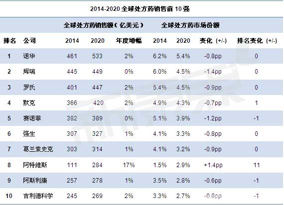 2014-2020全球处方药销售前10强