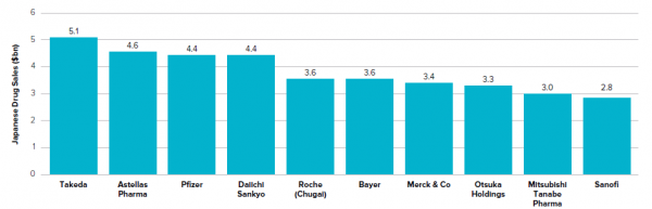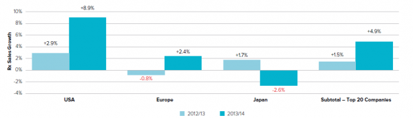 根据当地货币增长情况,美国、欧洲、日本排名前20的医药公司销售额上涨4.9%,美国上涨8.9%达2249亿美元,欧洲货币增长带动下销售额上涨2.4%,日本2014年下跌2.6%,日元持续下跌,兑美元汇率下跌10%。2014年4月,日本两年一度的医疗保险费用再度下跌,平均减少4.2%。