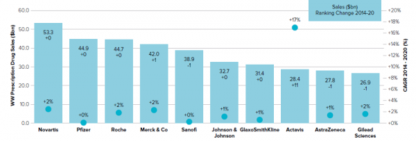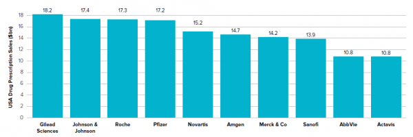 吉利德处方药销售额仍占据第一的位置,2014年销售额增加115亿美元,总计达182亿美元,辉瑞2013年排名第一下滑至第三现在位居第四。