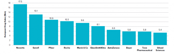 2014年欧洲销售额上涨2.4%,诺华稳居第一,吉利德首次进入前十。2013年,欧洲处方药销售额下降0.8%,2014年上涨2.4%。诺华仍然是欧洲最大的处方药销售公司,2014年销售额达175亿美元,吉利德首次进入前十,2014年销售额上涨50%达41亿欧元。