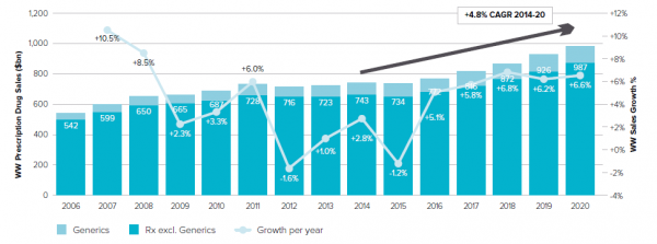 据分析,全球前500医药及生物技术公司处方药年均增长率将达到4.8%,至2020年,总销售额将达到9870亿美元,这比去年预估数据减少300亿美元,但这有可能是欧元贬值引起的。2015年至2020年,将有价值1970亿销售额的产品面临专利到期的威胁,根据目前市场情况,其中990亿将兑现。2009年至2014年,共有1200亿美元销售额因专利原因损失,今后六年,生物药物到期也将影响大部分药物销售额。