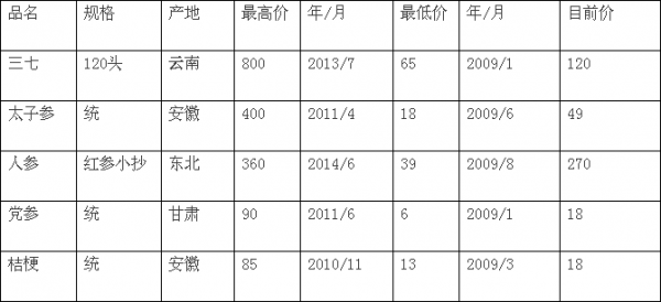 三七:虽然该品种辉煌价位已远去,但是,高价留下的影响是持久的。三七创药市神话,有着多种因素,多年低价,生产调减,自然灾害,人为因素等都是推高价格的条件。2009年三七自65元价格起步,之所以步步高升,主要是新货产不足需。