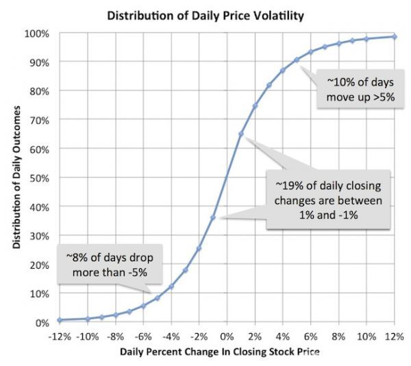 下文主要研究了112家2013~2014年上市的生物医药企业,它们如今还在运营,每天的收盘价都记录在案。可以预见,这些年轻公司股票波动很大。截止6月26日,122个交易日内,43%的公司股票跌幅超过1%,46%涨幅超过1%;8%平均跌幅超过5%,11%平均涨幅超过5%。下图为112家生物医药公司共计37000个收盘价统计结果。