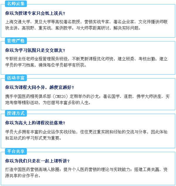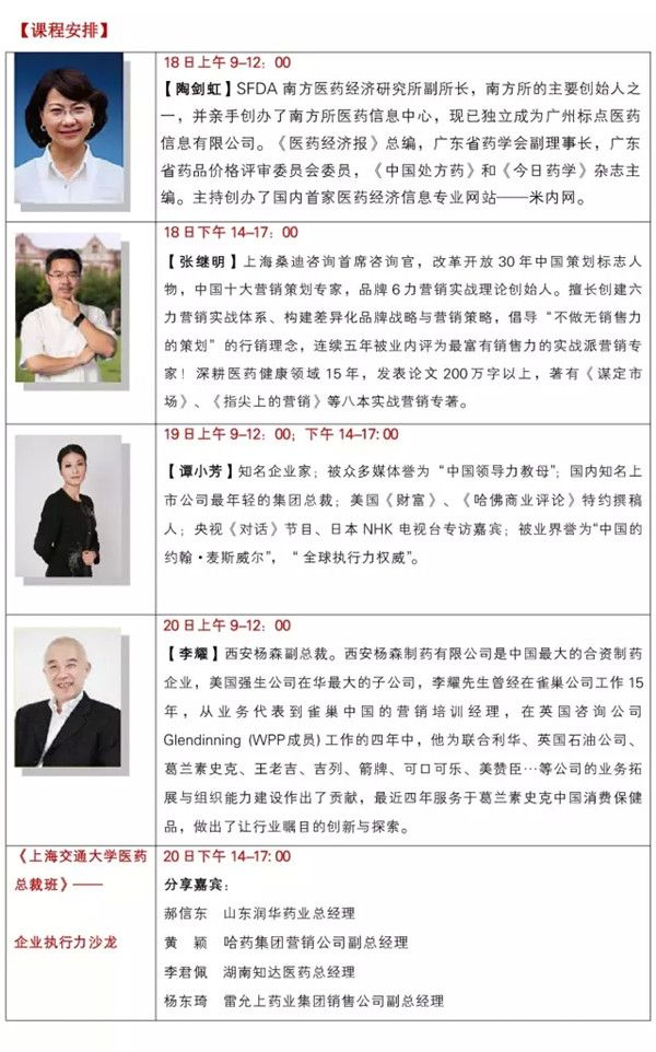 《上海交通大学医药总裁班》 执行力课程,由陶剑虹、李耀、谭小芳、张继明等多位医药经济专家和营销咨询专家为您带来一场思维意识的碰撞,亲身讲解实战中如何提升企业的营销执行力;同时穿插多个实践环节和课题讨论,让您在头脑风暴中理解执行力,贯彻执行力!