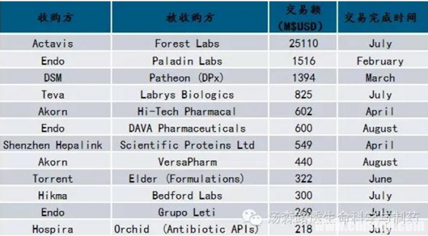 如上表,在2014年,仿制药领域的交易频出。但与Actavis收购Forest's相比,多数交易都显得相形见绌。但是,仍可以看到全球很多公司都在参与重大交易。通过收购,能够获得市场准入和加强多元化投资组合的机会。许多仿制药公司愿意通过合作和收购进入新兴市场,主要会考虑在当地的知名度和对当地市场的了解。总部设在药政市场的公司为了应对合规和成本的增加,会在其他区域改进工艺、投资设施或者选择特定能力公司。一些大型的仿制药公司通过合并工厂提高效率。