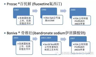 1. 尽早立项,争做"首仿"原料药供应商:具有竞争力的原料药企业会在药物确定上市之后,甚至在三期临床阶段就开始了药物化学、制剂等方面的研究。如下图,从ThomsonReutersNewport数据库收录的药物细节信息可以看到,1987年上市的"百忧解"在上市后第三个年头中,OlonSpA公司就已经备案了面向美国的DMF,2000年FDA才公布了有PIV挑战的ANDA;而最近10年来这个速度逐渐加快,而在"骨维壮"上市前的申报阶段,Sun和Teva公司就已经开始开发相应合成放大工艺,并在该药物上市时就已经公开了相关专利。而且在n-1的时间点("骨维壮"获批4年),多家仿制药公司为获取180天的首仿独占期,对于该药物的专利提起PIV专利挑战并同时申请ANDA。作为仿制药企业如果能早窥这一先机,也许就有可能与仿制药联合申报ANDA。据闻这在国内也有了先例。