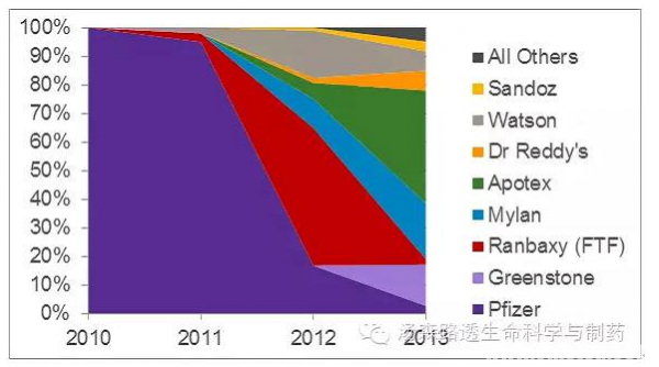 (atrovastatin是竞争非常激烈的品种。仿制药上市后,除了原研药企业Pfizer销售额急剧下降外,还可以看出Pfizer子公司分销公司Greenstone的市场份额逐步增加,而在2012年市场占有率第一的企业Ranbaxy由于产品质量问题,被迫车会产品。市场空间迅速的被Aptex和Mylan接管)