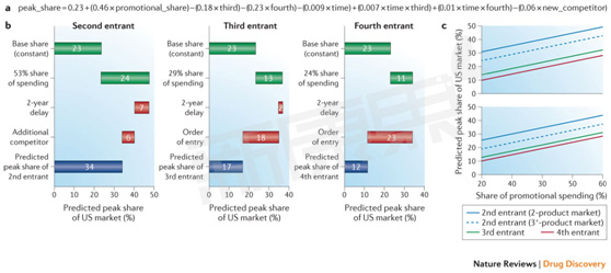 通过私人供应商提供的促销费用和市场份额数据,杜克大学的研究者们发现,第二个上市的药物,如果落后首个上市的药物2年的话,即使在销售顶峰,也只能获得34%的市场份额。这还是在第二个上市药物所花费的促销费用和第一个上市的药物完全相同的情况下。
