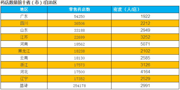 从全国药店数量最多的十大省市自治区来看,广东、四川、山东、江苏、河南、黑龙江、云南、浙江、河北以及辽宁药店总数达254178家,占到了全国药店数量的57.93%左右,十个省市自治区的药店数集中了全国的一大半,属于药店高密度地区,平均药店密度为2991人/店。(药店密度根据2010年全国第六次人口普查数量计算)