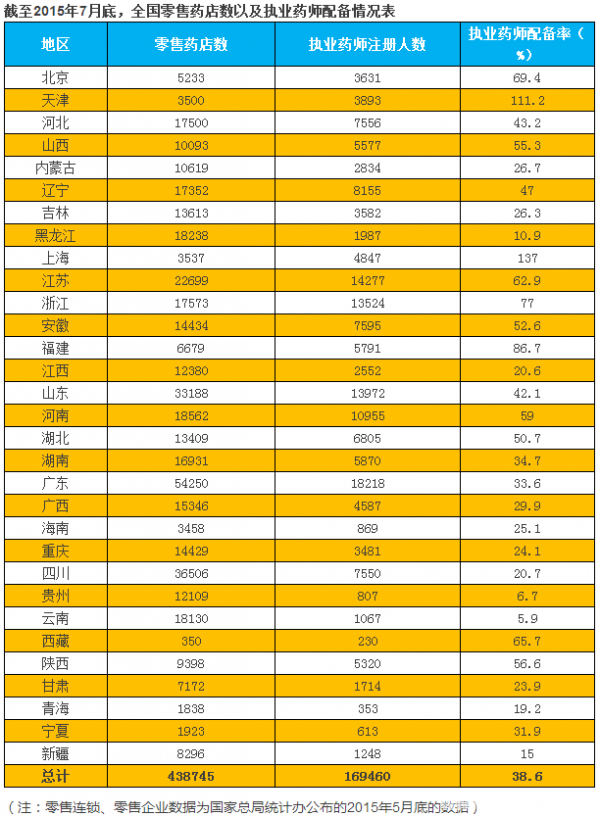 根据CFDA执业药师资格认证中心发布,截至2015年7月底,社会零售药店共计438745家,药店执业药师注册人数总计169460人,执业药师平均配备率仅为38.6%左右。根据发布数据,对我国药店数量前十的省(市)/自治区及配备率的前十后五再做一个简明的梳理。