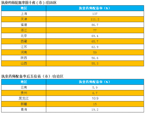 值得一提的是,排在全国数量第7位的云南省,执业药师的配备率却是全国倒数第一,不到6%。