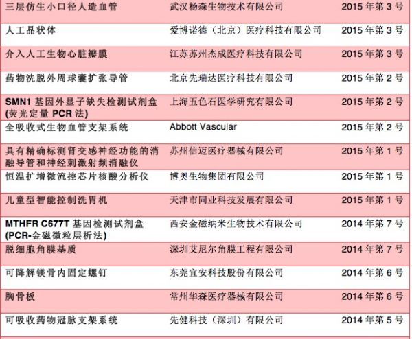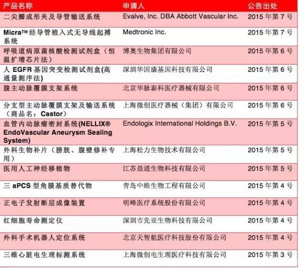 《创新医疗器械特别审批程序(试行)》自2014年3月1日起施行。该程序是在确保上市产品安全、有效的前提下,针对创新医疗器械设置的审批通道。综合2014年至2015年国家食品药品监督管理总局医疗器械技术审评中心公示公告发现,2014年共17个项目、2015年至今有23个项目进入特别审批程序。博奥生物、上海微创、深圳华因、先健科技(深圳)和Abbott Vascular均有2个项目进入特别审批程序。
