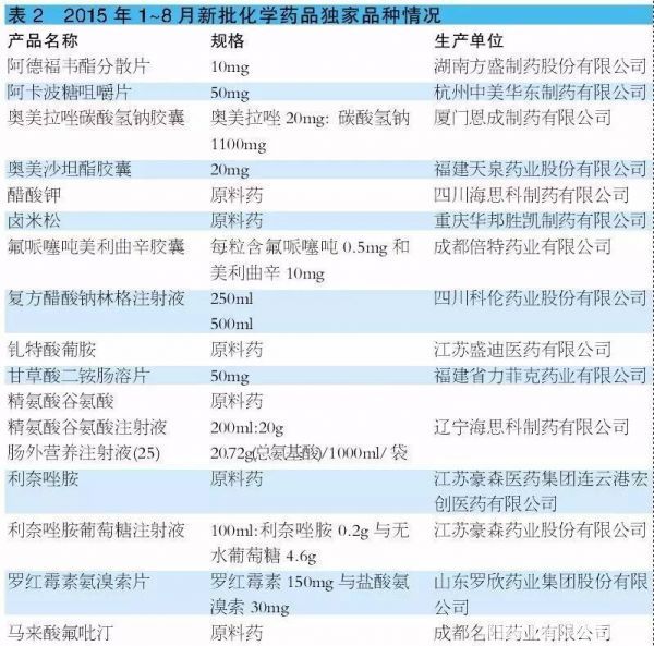 2015年1~8月所获得的化学药品新批文中,独家品种有30个。其中,辽宁海思科制药有限公司有三个独家品种获批,分别是肠外营养注射液(25)和精氨酸谷氨酸注射液及其原料药,其为1~8月获批独家品种最多的企业。