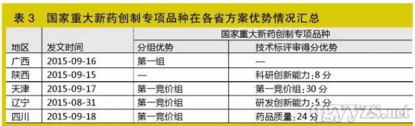 根据国家精神,药品采购范围优先选择“符合临床路径、纳入重大疾病保障、重大新药创制专项、重大公共卫生项目的药品,兼顾妇、老、儿用药需要,并与医保、新农合报销政策做好衔接”,故国家重大新药创制专项品种在各省投标门槛上极具优势。另外,据统计,目前广西、陕西、天津、辽宁、四川等5个省已将此指标作为竞价分组、评审加分的指标(见表3)。