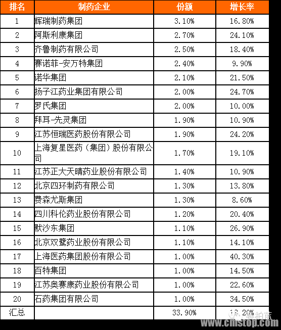 医院采购额前20名的药企,占据医院药品市场近34%的市场份额,18.2%的增长率高于2014年全国医院用药平均值。前二十家药企中,共计11家本土企业、9家外资企业。