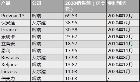 表:预计辉瑞和艾尔建合并后,2020年销售额头10位的产品