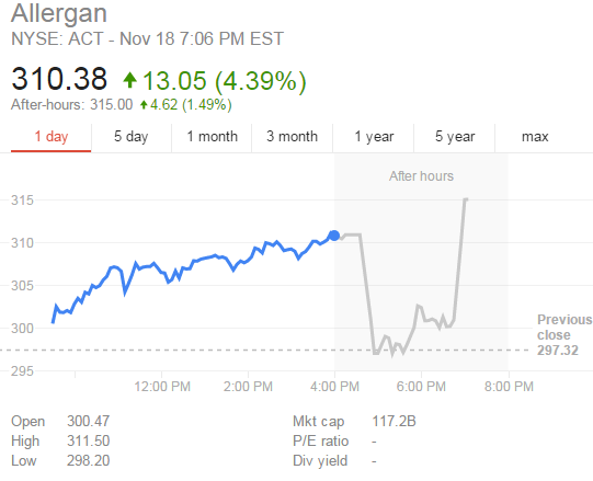 消息公布后艾尔建盘后股价由跌转涨,此前由于美国财政部的限制税收倒置的文件,艾尔建股价一度下跌: