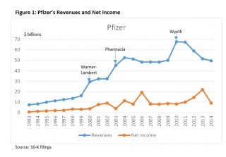 今天著名制药分析家Bernard Munos在福布斯的专栏文章中质疑辉瑞依靠收购维持增长的经营模式。反复收购虽然大大增加销售额,但净利润增加有限。2000年辉瑞市值1200亿,现在2000亿,和麦当劳汉堡的价格增长速度差不多。虽然股东得到950亿美元的分红,但辉瑞股票现在比1999年还低(当然那时生物制药有泡沫)。他认为使用创新药物病人的下降是整个行业增长的最主要压力,当然这对所有药厂都一样。生存的关键是提高单位病人的利润,但通过涨价已经空间有限。他说辉瑞有人才、有魄力、有资源,不需要转移总部避税这样的手段(海外现金可以用来收购海外技术)。