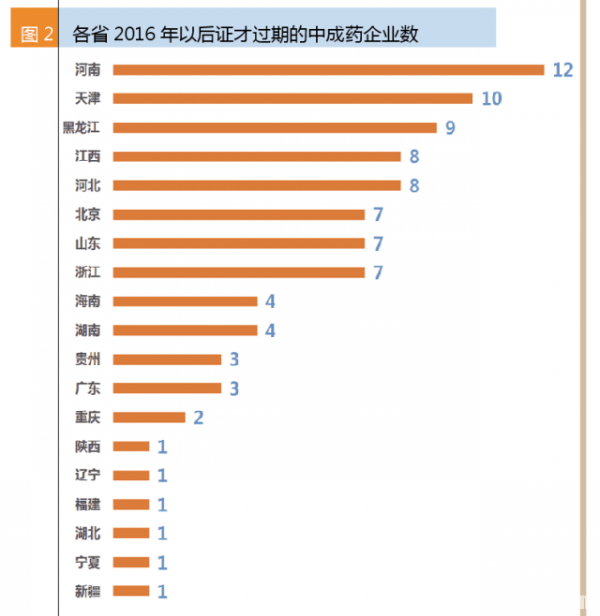 2016~2019年才过期的90家中成药生产企业中,河南的企业最多,共12家;其次是天津,共10家;第三是黑龙江。一些中药企业较多的省份都是2015年到期,如吉林、广西和四川。即使是有着中成药传统的广东,2016年后才过期的只有3家。