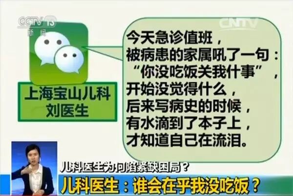 “今天急诊值班,被病患的家属吼了一句,你没吃饭关我什么事,开始没觉得什么,后来写病史的时候,有水滴到了本子上,才知道自己在流泪”,这是一名儿科医生发的微信朋友圈。
