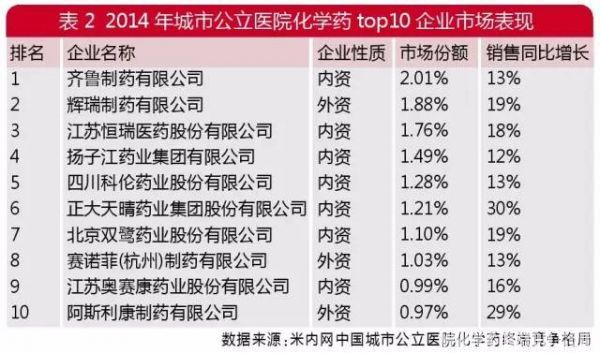 从厂家角度来看,城市公立医院化学药市场领导厂家逐步被内资企业占据,2014年仅有辉瑞、赛诺菲、阿斯利康3家企业进入国内公立医院销售前十榜单。Top 10企业的主要产品以抗肿瘤药、心血管药、抗感染药及消化系统药物为主。