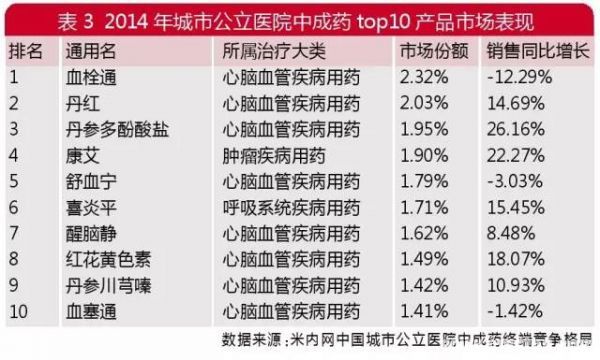 2014年,城市公立医院中成药Top 10产品全部为中药注射剂,但Top 10品种中除了丹参多酚酸盐、康艾等少数品种保持较高增速外,其余畅销品种普遍增长乏力,甚至出现了负增长。