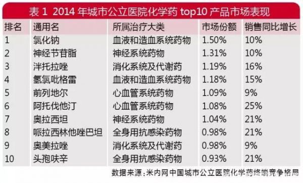 一方面,医保控费、药品招标降药价、限抗等因素遏制了城市公立医院终端药品销售市场的过快上涨;另一方面,县级公立医院的快速增长令城市公立医院的药品占比呈现下降趋势,这种趋势在未来一段时间仍将持续。但是,作为国内最大的药品销售终端,城市公立医院市场仍旧扮演着举足轻重的角色。