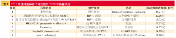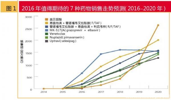 对2016年上市药物的销售额进行预测,2020年销售额排名最高的药物依次为:奥贝胆酸(26.21亿美元)、恩曲他滨+替诺福韦艾拉酚胺(F/TAF;20.06亿美元)、替诺福韦艾拉酚胺+恩曲他滨+利匹韦林(R/F/TAF;15.72亿美元)、MK-5172A(15.37亿美元)、Venetoclax(14.77亿美元)、Nuplazid(14.09亿美元)、Uptravi(12.68亿美元)。