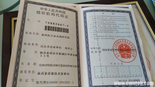 陕西医大血友病研究院组织结构代码证。澎湃新闻记者 陈兴王 图