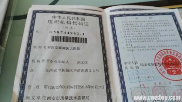 西安新城医大医院组织机构代码证。澎湃新闻记者 陈兴王 图