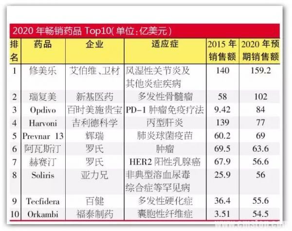 EvaluatePharma一直在探索研究以上问题的答案,其近期推出了2020年全球最畅销的20只药物销售预测,本文主要关注前10只药物的市场现状与接下来5年发展趋势。在2020年畅销药品Top 10榜单中,“熟面孔”居多,也有两只近两年获批的“新鲜血液”。