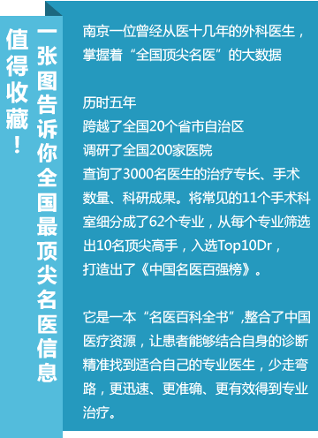 南京一位从医几十年的外科医生,掌握着“全国顶尖名医”的大数据。历时五年,跨越全国20个省、市、自治区,调研了全国200家医院,查询了3000名医生的治疗专长,手术数量、科研成果,将常见的11个手术科室细分为62个专业,再从每个专业中筛选出10个顶级高手,入选榜单,打造出《中国名医百强榜》。